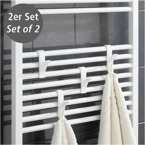 Le lot de 2 crochets radiateur sèche serviette, apporte des possibilités de suspension supplémentaires sur le radiateur de la salle bain. De couleur blanche, les crochets sont fabriqués en matière plastique robuste et conviennent à tout radiateur sèche-serviettes standard. Sans exiger de montage, les crochets sont utilisables immédiatement et peuvent être accrochés sans problème sur le radiateur sans le rayer.