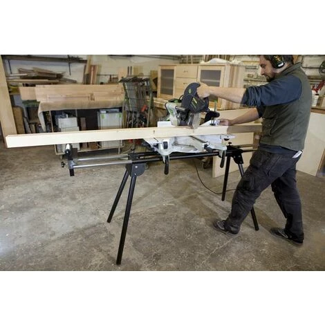 Support de scie à coupe transversale et à onglet très robuste, utilisable avec toutes les scies à coupe transversale et à onglet disponibles dans le commerce. Assemblage rapide et facile et prêt à l’emploi. Le stand peut être facilement transporté sur le lieu d’utilisation grâce à son pliage simple et son faible poids.